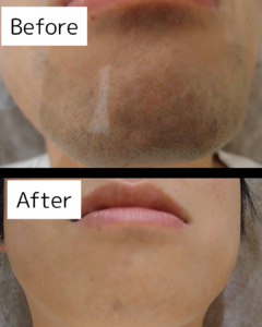 かなり濃いおひげの脱毛です。ビフォアー画像はジェルを塗った後に撮影したため、ジェルがついております。画像で見るよりもかなり毛が濃いお客様で口周りにビッシリ濃い剛毛がありましたが、ほぼ生えなくなりました。少し唇の下にある毛を脱毛したら完了です。髭剃りをしなくて良くなったと喜んでいただき、私も大変嬉しいです。