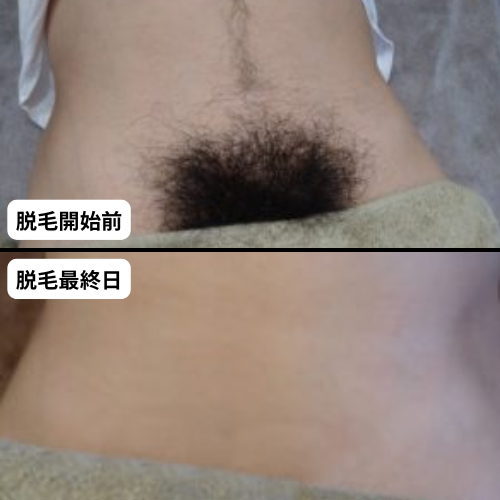 脱毛の経過画像です。初めのうちは脱毛後、上記のようにまばらになってきます。この状態のように少し生えてきたところで照射を繰り返し脱毛を完了させていきます。